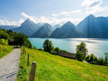 Starting from the boat, train, and bus station Flüelen, the hike begins leisurely along the lakeside promenade. Soon follows a fairly steep ascent over artistically made stairs to the old Axen road. Directly above the rock, you walk with a magnificent view of the lake and mountains on the route of the first north-south road at Lake Uri. After forested areas with a southern character, you reach the largest carillon in Switzerland.