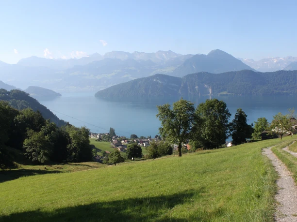 The starting point is at the boat station in Weggis. From the village crossroads, follow Rigiblickstrasse (between the school and parish church) and Untereggistrasse straight ahead. At the farmhouse "Schlosshof" keep right; on the paved road, you pass more farms. After a few hairpin bends, you reach the charming house at Unterstutzberg. After crossing the meadow, you go through a short forest section. The path continues to rise until reaching a paved road. Cross this and continue uphill through the forest. Soon the Alpwirtschaft Räb comes into view. Your efforts are rewarded with a fantastic view of Lake Lucerne and the lowlands.