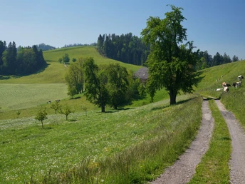 From the old town, the path passes the Landvogteischloss and goes through the sports facilities towards Chalchtaren. After a steep ascent, the beautiful view of the diverse Napf foreland surprises. On one of the many ridges of a Napf foothill, you hike via Mettenberg over a beautiful plateau to Mörisegg, a former retirement home.