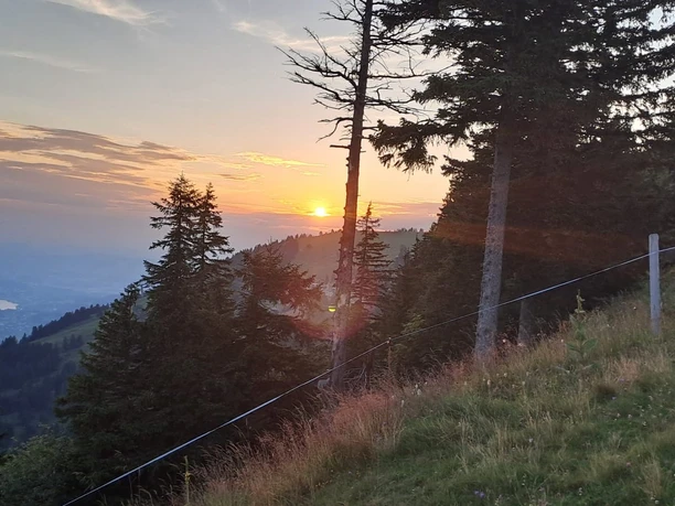 La randonnée circulaire guidée, à la rencontre du coucher du soleil et du lever de la lune, commence à la station supérieure du téléphérique Kräbel Rigi Scheidegg et mène à travers les Alpes de Vitznau jusqu'à Unterstetten et retour au Rigi Scheidegg, où une soupe chaude accompagnée d'un bon thé attend les randonneurs.