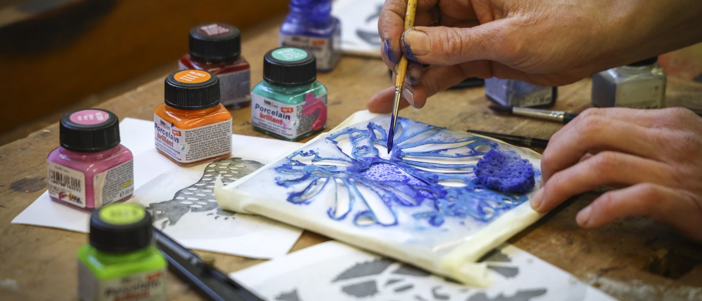 L'après-midi d'atelier au Château de Hallwyl est consacré à la création de carreaux de faïence qui embelliront la table de la maison sous forme de dessous de pot colorés. Que ce soit avec des pochoirs ou peints librement, la créativité n'a pas de limites.