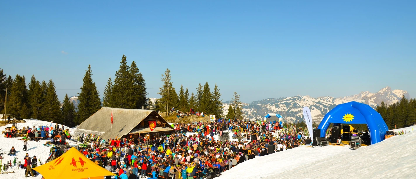 A partir de 11h00, un service de restauration, un bar à shot et un son de fête avec de la musique live vous attendent à la Mauris Hütte sur le Stoos.
