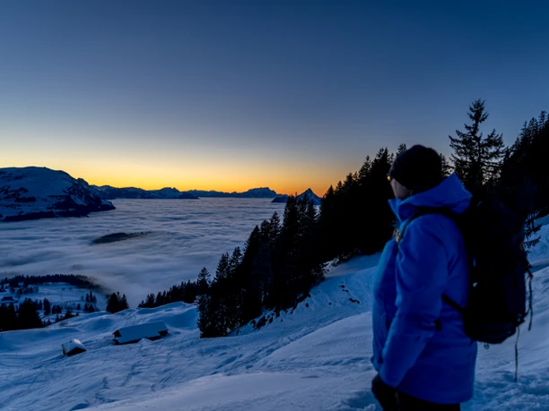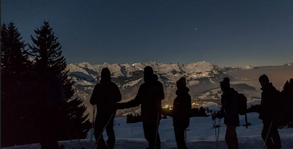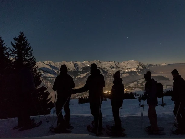 Sous la lumière argentée de la lune, cette randonnée en raquettes au clair de lune offre une ambiance hivernale toute particulière. Les champs de neige scintillants, les ombres d'un bleu profond et l'atmosphère calme de la nuit font rapidement passer le quotidien au second plan. Le mouvement régulier dans la neige et l'air pur de la montagne font de cette randonnée une expérience intense de la nature qui, malgré un léger effort, est ressentie comme agréable et décélérante.
