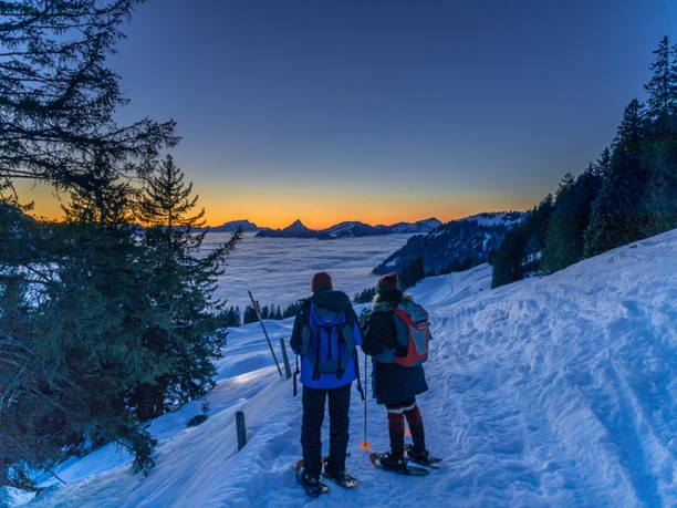 D'autres dates sont possibles sur demande. La randonnée en raquettes dure environ 2 à 3 heures. Les raquettes, les bâtons ainsi qu'une lampe frontale sont mis à disposition. Le nombre de participants étant limité, une inscription préalable est nécessaire.