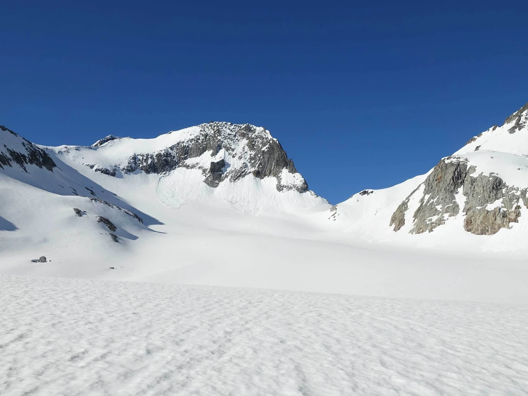 2ème jour : Tôt le matin, nous commençons notre randonnée en raquettes et montons sur le glacier du Witenwasseren jusqu'au col du Witenwasseren (2805m), environ 1 ½ heure.