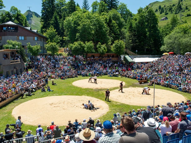 Rencontre au sommet sur le Stoos : soyez de la partie le dimanche 14 juin 2026 pour la première fête de lutte de montagne de la saison ! Chaque année, les "méchants" de la lutte suisse se retrouvent sur le Stoos pour une épreuve de force au milieu d'un décor de montagne à couper le souffle. Le Stoos-Schwinget est toujours la première des six fêtes de lutte de montagne organisées en Suisse.