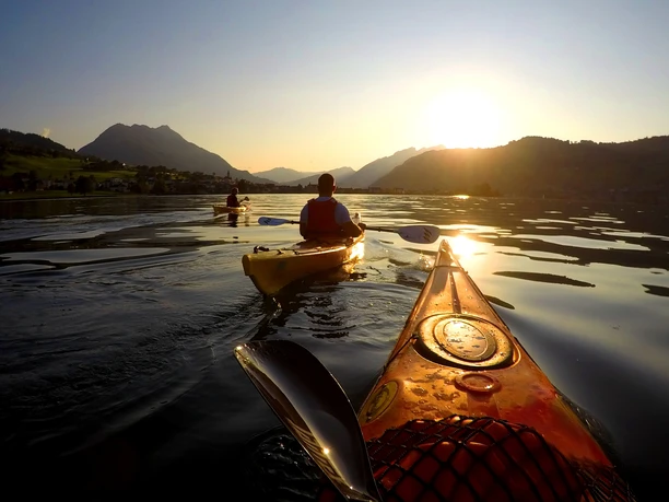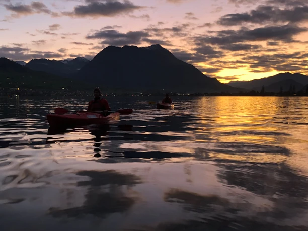 Sunset-Paddle, c'est le romantisme du soir à l'état pur : admirer ensemble le coucher de soleil sur le lac des Quatre-Cantons et vivre une descente en canoë inoubliable en kayak de mer ou en canoë. Vous serez accompagnés par des moniteurs de canoë compétents. C'est un moment fort pour les personnes inexpérimentées et expérimentées et une possibilité idéale de s'initier au canoë.