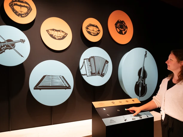 "La musique populaire" est une exposition à laquelle on peut participer : Sur une scène au milieu de la salle, on peut jouer du cor, du yodel et danser. Des pupitres avec des instructions invitent à s'essayer à la musique. L'exposition présente également les différences régionales de manière divertissante : Ce qui est en plein essor en Suisse centrale sonne souvent très différemment au Tessin, dans les Grisons ou en Suisse romande.