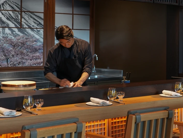 Une attention particulière est accordée à l'utilisation de produits de saison. Associé à l'exécution magistrale de techniques japonaises classiques, un menu pour tous les sens est servi devant les hôtes. Le tout est accompagné d'une large gamme de saké qui complète parfaitement les plats raffinés.