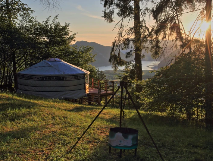 La forme ronde et l'ambiance chaleureuse de la yourte te donnent un sentiment de calme et de sécurité. L'environnement magnifique et la vue fantastique sur le lac des Quatre-Cantons, le Stanserhorn, le Rigi et le Pilate complètent l'expérience particulière de la yourte.