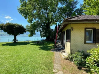 Cosy holiday cottage, directly on Lake Sarnen in the middle of a beautiful garden. Quiet, unspoilt location with views of the lake and the surrounding Obwalden mountains. Centrally located for all kinds of leisure activities. Swimming, rowing, stand-up paddling, fishing, hiking and mountaineering in the surrounding mountains, cycling, motorbike tours, etc. Indoor activities of all kinds are also within easy reach! 1 room studio with everything you need for your holiday. Cabin bed for 2 persons. Kitchenette, shower, WC, etc. Wifi, satellite TV, radio, reserved car park, quiet surroundings, communal garden with steps and access to the lake, motorised rowing boat for hire, separate fireplace room, barbecue area, plenty of seating and tables and space for everyone! (Mixed use: permanent tenants and holiday guests.) Washing machine and tumble dryer in the main house. Sports facilities in the neighbourhood: Fishing Basic information - Pets allowed: 2 - allowed size of dogs: large (more than 60 cm) - size of property: 1900 m² - Year of the last complete renovation : 2020 - detached house - non-smoking - Number of bedrooms: Studio apartment (no separate bedroom) - Number of bathrooms: 1 Top features - WiFi - Total of private car parking spaces: 1 - ㄴ of which private outdoor parking spaces: 1 Sleeping in the living area - bunk bed Bathroom bathroom 2 - shower Guest toilet (or WC) - toilet Cooking/Living - number of living rooms: 1 - fireplace - stove Entertainment - TV: TV, satellite TV Utility - washing machine: For communal use in the building Outside area - grill/barbecue: grill/barbecue Surroundings - lake: 1 m - boat hire - ski vacation - distance to cross-country skiing: 14,0 km - mountain rail: 17,0 km Distinctive features - Suitable for fishing surface du terrain: 1900m².