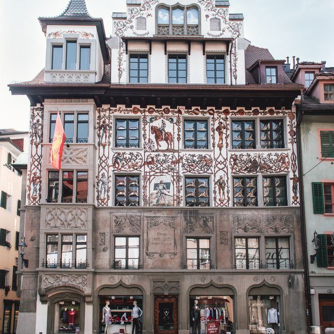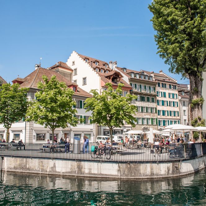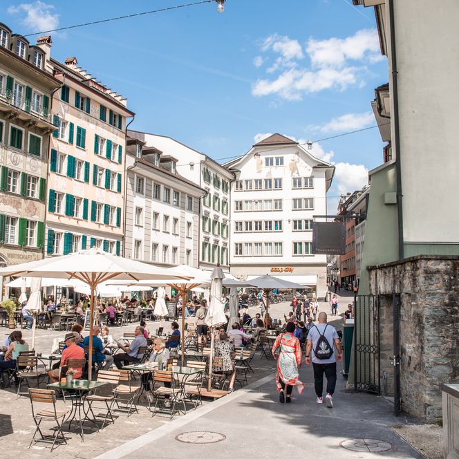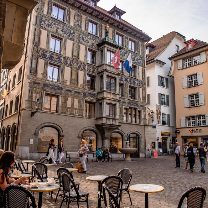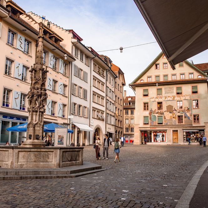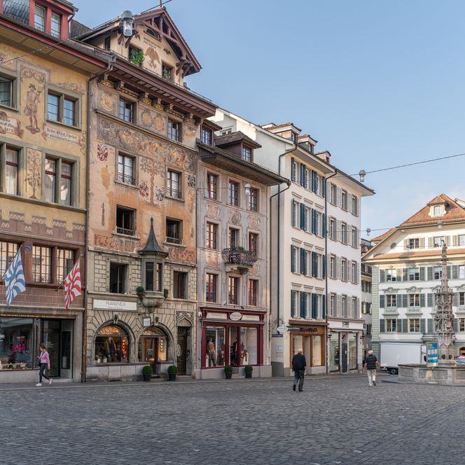 À la place Weinmarkt, par exemple, un véritable bijou où en 1332, les habitants de Lucerne ont prêté serment pour adhérer à la Confédération helvétique alors formée des cantons d’Uri, de Schwytz et d’Unterwald. En outre, la place Weinmarkt a accueilli un marché aux poissons jusqu’au milieu du XVIe siècle. La place a pris sa forme actuelle en 1841, après la destruction de la halle du marché en bois de deux étages où l’on vendait de la viande, du pain et du cuir. La fontaine Weinmarktbrunnen, qui remonte à 1481, passe pour l’une des plus belles de la ville. C’est l’œuvre de Konrad Lux, qui y a travaillé dix ans avant de la terminer. Le bassin hexagonal a été remplacé par un bassin octogonal au XVIe siècle. La colonne de la fontaine a également été travaillée à plusieurs reprises avant que le sculpteur Leopold Häfliger réalise la colonne actuelle en calcaire coquillier. L’original se trouve aujourd’hui au musée historique à la rue Pfistergasse.