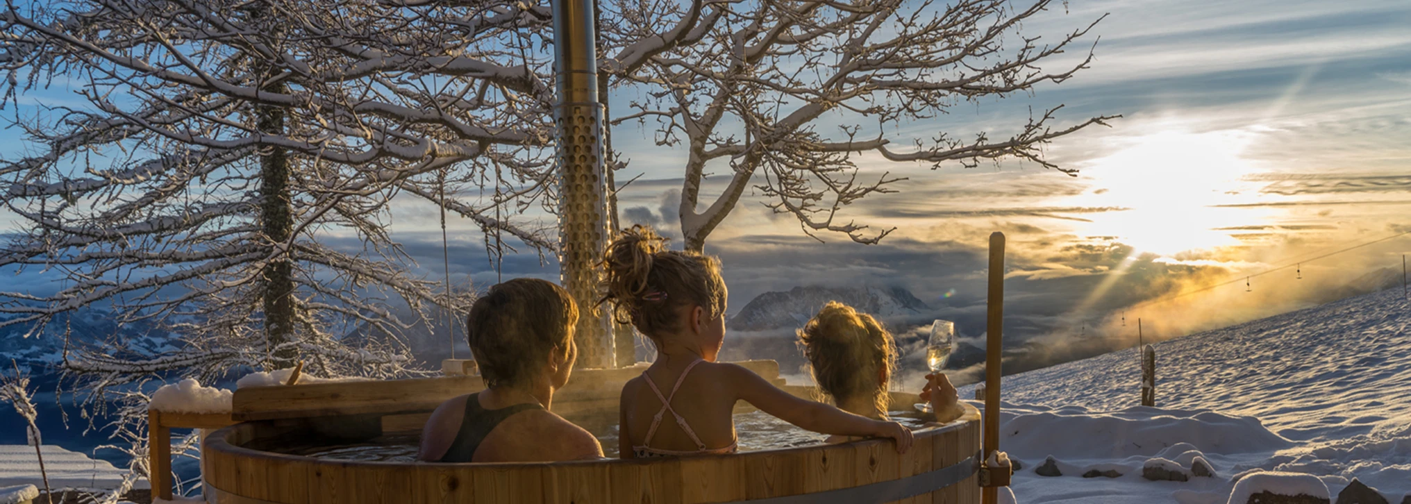 L'eau pure de la source du Rigi, l'air pur des montagnes, la magie du bain de bois mis à la terre, le feu qui réchauffe.