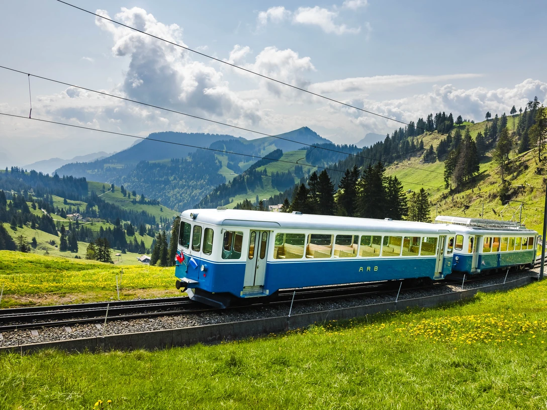 De l'arrêt A4, le Rigi Bahn grimpe le tracé escarpé jusqu'à Rigi Kulm. À la station intermédiaire Kräbel (à environ 10 minutes de Goldau), il est possible de prendre le téléphérique Kräbel-Rigi Scheidegg. Le Rigi Bahn serpente à travers des forêts et des tunnels, des prairies généreuses et des cascades abruptes jusqu'au sommet du Rigi Kulm. Le trajet en train permet d'admirer régulièrement le vaste Plateau suisse et le lac de Zoug. Le voyage dans l'une des nombreuses voitures historiques est une expérience en soi. Dans les magnifiques wagons nostalgiques datant des années 1871 à 1911, on peut profiter librement de la vue panoramique à l'air frais des montagnes. Le point culminant est un voyage avec les locomotives à vapeur n° 16 et n° 17, construites respectivement en 1923 et 1925.