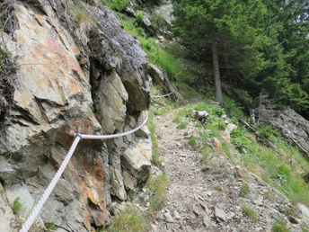 La traversée de la vallée type moraine de Schipfental est facilitée par une passerelle suspendue longue de 48 mètres. Nous atteignons Waldiberg avec une légère montée à travers les prés de montagne. Nous montons à gauche et suivons les marques fixées aux blocs rocheux et aux sapins vers Eisten (1443 m). Là, nous pouvons nous reposer une dernière fois sur le grand banc en face de la belle montagne Bristen. Nous randonnons ensuite sur un sentier partiellement sécurisé par des escaliers métalliques, à travers les forêts de montagne raides, toujours en direction de Golzern. Peu après, nous entrons dans la légendaire vallée de Maderanertal. Ensuite, le chemin descend à travers Widderlaui vers le large chemin en hauteur qui nous mène plus loin à Golzern avec ses auberges soignées et le proche lac de Golzern (1411 m).