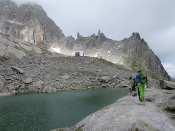 Le chemin monte ensuite à travers un flanc de moraine du glacier de Mutten jusqu'au Deieren-Älpetli (2593 m). Par la selle (2747 m) des Stotzigen Firsten, nous atteignons trois petits lacs cristallins. La route continue en direction nord-ouest à travers le versant sous le Blauberg en direction de la dépression fourchue du col de la Furka (2429 m) et, par un petit sentier juste au-dessus de la route du col, vers les Galenböden (hôtel Furkablick). Ici, un panorama incroyable s'offre à nous. Le Galenstock trône fièrement au-dessus de la vallée, à côté de lui s'élèvent d'étranges aiguilles de granit vers le ciel. Dans ce décor rocheux se trouve notre objectif du jour. Nous montons facilement au-dessus du col de la Furka et des Galenböden puis poursuivons vers la crête de moraine du glacier Sidelen. Après avoir traversé le ruisseau Sidelenbach (2524 m), nous atteignons après une dernière montée à 2708 m la cabane marquante Sidelenhütte SAC (2708 m) par les marches du sentier de cabane dans les débris glaciaires.