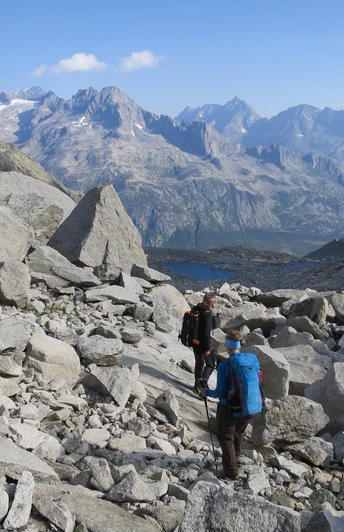 Depuis la Lochberglücke (2814 m), le sentier descend jusqu’au point 2780 m, puis tourne à droite sur une vire pour atteindre une zone plate. Par un pierrier et des blocs rocheux, nous descendons ensuite vers le lac Älpergensee (2510 m) et par des marches rocheuses glissantes jusqu’au pont, où nous rejoignons le sentier circulaire du lac Göscheneralpsee. De temps en temps, des chèvres croisent notre chemin.