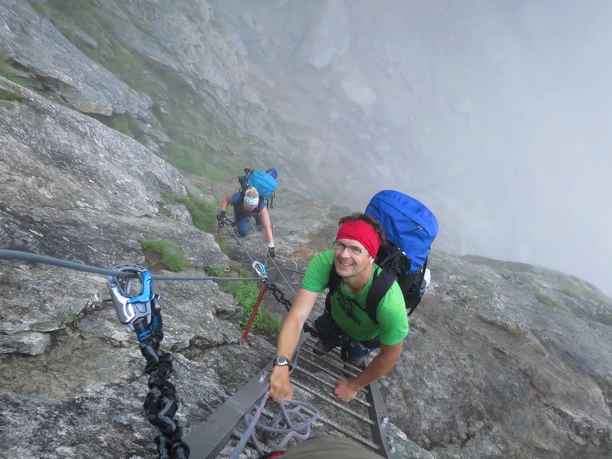 Derrière la cabane Voralphütte SAC (2126 m), nous suivons un sentier raide en direction du Chüeplanggenstock jusqu’au Flüestafel (2385 m). Ici, l’itinéraire marqué en blanc-bleu-blanc tourne vers le sud-est, monte au-dessus du couloir abrupt du Chüeplanggenchelen (2500 m) jusqu’aux avant-pentes du Rothorn, puis redescend dans un terrain rocheux avec gros blocs jusqu’au Horenfelliboden (2541 m). Ensuite, un premier obstacle : une paroi escarpée est franchie par une échelle en fer haute de 45 mètres en descente. Avec une concentration totale et sécurisé par des câbles d’acier, le via ferrata traverse une rainure rocheuse dans un paysage de granit sauvage. Après une chambre de terrain alpine escarpée, une autre échelle suit. Le sentier serpente abruptement dans la prochaine montée, dans la zone difficile T4, jusqu’à la bosse de la crête sous la première tour massive dans la crête ouest de Salbitschijen. C’est le moment de la pause repas !