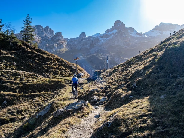 Cette grande boucle VTT est ponctuée de points forts : le spectaculaire canyon de la Muota, le pont historique Suworowbrücke, la montée finale raide vers le Wannentritt, la traversée techniquement exigeante vers Riemenstalden, le chemin panoramique de la Suisse ainsi que – en guise de dessert – le sentier VTT Le plus Beau, parsemé d’éléments Nordshore. Impossible de faire mieux, cette boucle comporte tout ce qui rend le VTT attractif. Les exigences physiques ne sont pas à sous-estimer, tandis que le niveau technique n’est pas trop élevé. Pour se restaurer en cours de route, le restaurant Chaiserstock à Riemenstalden avec sa belle terrasse de jardin est une bonne option.