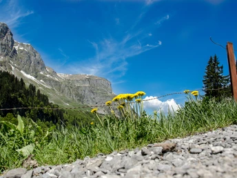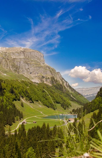 Le bassin de retenue, construit en 1960, ne convient pas pour la baignade, mais au bord du lac se trouvent des bancs qui invitent à la détente et à profiter de la vue magnifique. Après cette pause bien méritée, le chemin vous mène par la Muota au Gross Gade. Après un court tronçon sur la route naturelle en direction de Gwalpeten, le chemin bifurque à gauche vers Spitzbächab (P 1384 m). Ici, la vue vers la sortie de la vallée avec le lac Sahlisee d’un bleu éclatant vous surprendra. Vous suivez le chemin bien visible à travers la Plangg en direction de Milchbüelen. À la jonction avec le chemin Glattalp, descendez quelques mètres vers la route et suivez-la jusqu'à Milchbüelen. Ici, la vue est dégagée sur la cascade imposante qui tombe en plusieurs étapes sur le versant opposé. Après l'alpage idyllique de Milchbüelen, le chemin continue à bonne allure. En chemin, vous apercevez en bas à gauche la cabane Eigelihütte, où le musicien de musique traditionnelle Rees Gwerder a été marqué dans son caractère par le paysage durant sa jeunesse. Au Feldmoos, il faut marcher quelques mètres sur la route asphaltée avant que le chemin ne vous mène à gauche à travers la Plangg jusqu'à la Schmallauistrasse. Sur cette route, vous marchez jusqu'à la Salihöchi puis vous vous diriger vers la sortie de la vallée et le point de départ.