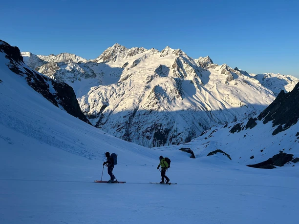L'un des sommets les plus connus est le Bächenstock. Le chemin monte à travers de magnifiques paysages enneigés et le glacier du sommet. On devine déjà la magnifique descente qui nous attend.
