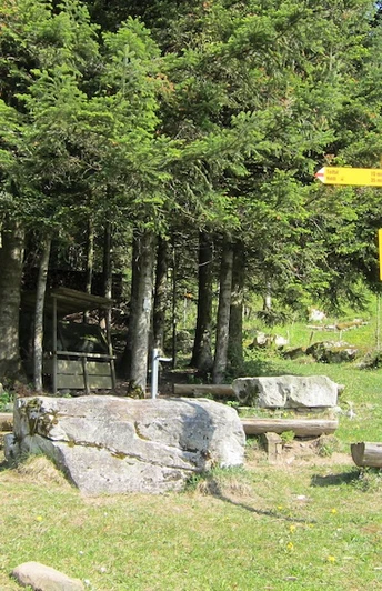 Nous commençons à la station supérieure du téléphérique aérien Schattdorf-Haldi. Après seulement 200 m, un nain nous accueille sur la droite. Nous prenons à droite et marchons sur la terrasse ensoleillée en direction de Pappental. Bientôt, nous revenons dans la forêt, traversons le Gangbach et, après environ 45 minutes, atteignons le Figstuel. Là, près de l'aire de feu, nous faisons une pause, mangeons un peu et laissons jouer les enfants.