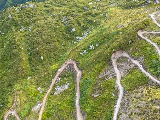 La route en gravier jusqu'à Gendusas est plutôt fonctionnelle – mais le Catrina Flowtrail compense par un pur plaisir de virages et de conduite ! Le parcours se termine par une descente gourmande à travers la vallée de Segnas jusqu'à Acletta, à la station aval.