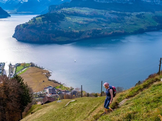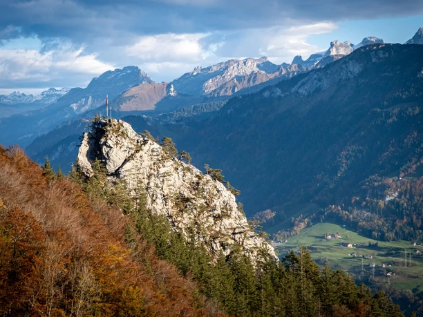 Dans le langage populaire, la tour rocheuse marquante dans la forêt de montagne est appelée « Pouce » en raison de sa forme. Sur la carte nationale, elle s’appelle Stockflue et est la destination d’une populaire courte randonnée alpine au-dessus du lac des Quatre-Cantons. De beaux tronçons dans la forêt claire de pins alternent avec des passages rocheux raides, parfois équipés de câbles et d’échelons métalliques. Les non-initiés et les enfants peuvent ici être assurés avec une corde. Une dernière montée raide mène le long d’échelles et de câbles au sommet de la Stockflue avec sa vue phénoménale à pic sur le lac d’Urner. Ceux qui ne souhaitent pas prendre le petit téléphérique voisin choisissent de préférence la descente tranquille via Schränggigen.