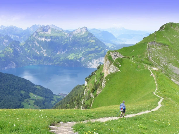 Avec le funiculaire le plus raide du monde, on atteint le village de montagne sans voiture Stoos. Un tĂ©lĂ©siĂšge conduit au point de dĂ©part de la randonnĂ©e â le Klingenstock. Bien sĂ»r, l'ascension est aussi possible Ă pied. Ceux qui partent vers l'ouest en direction du Rot Turm et du Nollen doivent ĂȘtre sĂ»rs de leurs pas et ne pas avoir le vertige. En bas, le lac des Quatre-Cantons accompagne la randonnĂ©e le long de la crĂȘte jusqu'au Huserstock. Ensuite, ça descend en zigzag sur un sentier creusĂ© dans la roche et sĂ©curisĂ© par des chaĂźnes jusqu'au Furggeli. La derniĂšre montĂ©e est la plus raide, de la cabane alpine au Furggeli jusqu'au sommet du Fronalpstock. Si le cĆur bat un peu plus fort en montant, la vue sur les montagnes et les lacs au sommet coupe le souffle. Sur la terrasse du restaurant le plus haut du canton, on peut se reposer et profiter de la vue. Le tĂ©lĂ©siĂšge ramĂšne au village de montagne Stoos. Ceux qui le souhaitent peuvent aussi redescendre Ă pied.