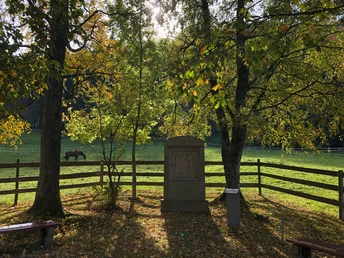 Le chemin de croix, créé entre 1930 et 1939, est une œuvre du sculpteur d'Einsiedeln Alois Payer (1878-1960). Il commence au point le plus au sud-est de la place du monastère, longe le Johannisbach et monte vers St. Meinrad, où la douzième station, un imposant groupe de la crucifixion, a été érigée.