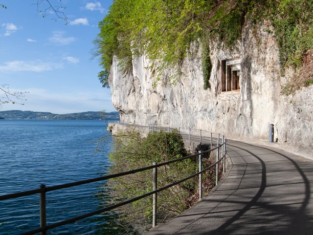 En passant devant la tour Schnitzturm, le parcours longe la route du bord du lac, parfois creusée dans la roche. Peu après la baie de Harissen, on passe l’entrée de l’ancienne forteresse militaire de Fürigen, un réseau de grottes de 200 m de long, aujourd’hui transformé en musée. Un kilomètre après la carrière, on entre dans le secteur de Kehrsiten. Le nom du village fait référence aux cerises (Chirscheten), qui poussent magnifiquement bien dans ce climat tempéré. Au niveau des premières maisons ou devant la station de bateaux commence la montée vers le Bürgenstock. Après les derniers fermes, le sentier forestier serpente jusqu’au Resort, et se termine par un « escalier suspendu » derrière les hôtels.