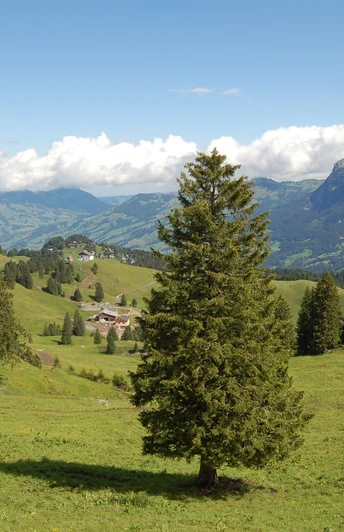 Nous traversons le village de Stoos en direction de Wannentritt - Muotathal. Aux dernières maisons, nous prenons la bifurcation vers « Holibrig » pour gagner de la hauteur et laisser le regard se perdre au loin. Pendant la première partie de la randonnée, les Mythen dominent le panorama. Après l'alpage Metzg, le panneau indicateur « Rinderchruteren » nous conduit en descente vers la forêt de Chruteren. Ici, la forêt apparaît à plusieurs reprises comme un contraste marqué aux douces prairies alpines. En raison du sol fortement karstifié, la forêt a été préservée, car elle ne se prêtait pas au défrichement pour les pâturages alpins.