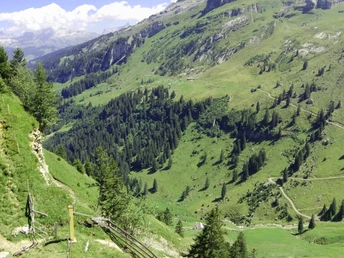 Pour descendre dans la vallée, nous choisissons le chemin au nord autour du Schwarzstock. À travers la forêt ombragée, nous atteignons le Höch Weidli, un balcon naturel sur la vallée de Muota. Un peu en dessous, nous découvrons pour la première fois une autre topographie en traversant une bande rocheuse. Avant la construction des routes alpines et forestières, ce sont les anciens chemins de liaison entre les établissements alpins et le village. À la Frutt, nous choisissons de nouveau un vieux chemin de liaison entre les hameaux et empruntons le parcours de randonnée via la Wissenwand jusqu’à la Flüelen inférieure dans la vallée. L'impressionnant chemin à travers les bandes de champs de la Unter Wissenwand était autrefois aussi le chemin scolaire des enfants de Wissenwand !