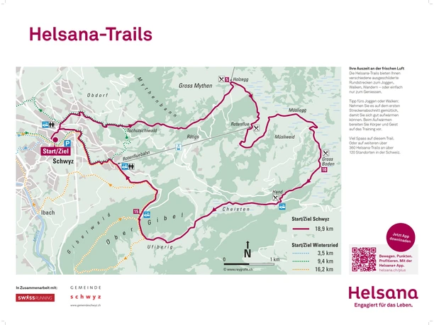 Le point de départ du parcours se situe dans le centre du village de Schwyz. Les premiers mètres se courent sur la route. Merci de respecter la circulation, les règles de la route ainsi que les autres usagers sur les trottoirs.