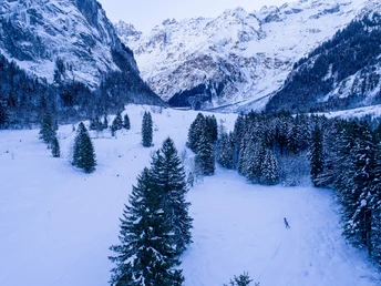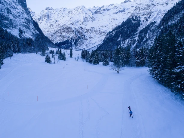 Le point de départ de ce parcours de ski de fond est la station de vallée Fürenalpbahn. Le parcours, exigeant sur le plan physique et technique, mesure environ 4 kilomètres et comprend une montée raide jusqu’à Herrenrüti. On commence tranquillement avec une légère montée sur le Herrenrütiboden. Ensuite, ça monte raide toujours vers les Spannörtern. Arrivé au sommet à Herrenrüti, le parcours fait une petite boucle puis redescend vers le point de départ. Située tout au fond de la vallée, la piste offre un paysage unique. On a presque l’impression de remonter le temps et à part son propre souffle et le craquement de la neige, rien ne se fait entendre.