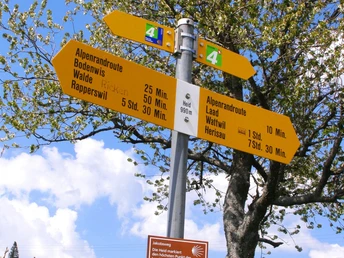 Nous partons de Rapperswil sur la piste cyclable 9 (direction Einsiedeln / Pfäffikon) au-dessus du Seedamm qui traverse le lac et mène à Pfäffikon. Nous continuons sur la piste cyclable 9. La route monte en pente raide parallèlement au chemin de St-Jacques jusqu'au point de vue de Luegete. Peu après, nous quittons la piste cyclable 9 et tournons à gauche en direction d'Etzel (panneau blanc). Nous suivons cette route, qui traverse plusieurs fois le chemin officiel, jusqu’à St-Meinrad.
