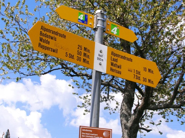 Ă€ Hinder Laad, nous jouissons d'une vue magnifique. Ici, nous pouvons nous restaurer dans une petite cabane avec des boissons. Nous suivons les panneaux ViaJacobi dans une longue descente jusqu'Ă la route principale oĂ¹ nous tournons Ă droite. Il y a ensuite une montĂ©e plus courte vers Oberricken. LĂ , nous quittons le chemin de St-Jacques et restons sur la route principale qui nous mène Ă RĂ¼eterswil par la forĂªt. A l'ancienne caserne de pompiers, nous tournons Ă gauche sur Kirchbodenstrasse (panneau - Kirchenboden). De lĂ , nous suivons les panneaux ViaJacobi sur la Breitenholzstrasse jusqu'Ă Breitenholz. LĂ , nous tournons Ă gauche et arrivons Ă Allmendstrasse sur un chemin de terre court mais irrĂ©gulier. Étant donnĂ© que l’itinĂ©raire officiel mène en partie Ă travers des sentiers de prairie, nous prĂ©fĂ©rons la route principale de Bezikon (Ă droite) pour arriver Ă St. Gallenkappel-Neuhaus. Ă€ Neuhaus, Ă l'hĂ´tel zum Ochsen, nous tournons Ă gauche dans Jakobstrasse et passons devant la belle chapelle St-Jacques. De lĂ , nous suivons le panneau indiquant la piste cyclable jusqu'Ă Schmerikon.