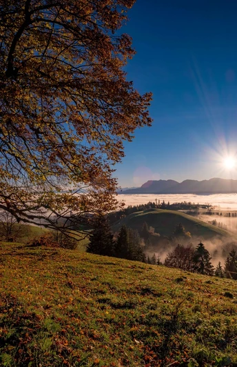 Après une traversée de la forêt, nous suivons brièvement la route principale avant de tourner à droite en direction de Längebüelschür et de passer par le beau emplacement de feu Ofenlochrutsche. Après un autre court tronçon sur l'asphalte, nous suivons un agréable chemin de gravier et sommes simplement subjugués par le beau panorama avec sa vue splendide. Et comme sur commande, le soleil apparaît désormais, nous permettant de faire une pause sur un banc avant de continuer vers Steinhuserberg. Là, une visite de l'église moderne St. Anna en vaut la peine.