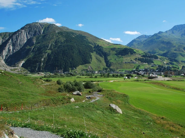 Une magnifique randonnée circulaire autour du parcours de golf Andermatt Swiss Alps. Ce qui est remarquable, ce sont les différences entre les prairies fleuries naturelles sur les pentes et les greens entretenus du parcours de golf. Les randonneurs sont récompensés par de superbes vues sur le parcours de golf et la vallée d'Ursern. Le parcours démarre à la gare d'Andermatt et se dirige vers l'ouest jusqu'au passage inférieur près de la centrale électrique d'Ursern. Par ce passage, on accède au chemin de gravier en direction du parcours de golf. On traverse le pont qui enjambe la Furkareuss et on passe devant le practice du golf. Ensuite, le chemin continue quelques mètres à droite. Avec une légère montée puis une descente, on atteint le village de Hospental avec une vue imprenable sur la vallée d'Ursern. Depuis Hospental, on revient ensuite le long de la digue de la Reuss jusqu'au point de départ.