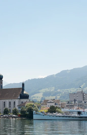 De la gare de Lachen, passez par la Hintere Bahnhofstrasse, devant l’église paroissiale Heiligkreuz, jusqu’à l’ancienne place de l’école en direction de Seeplatz (route 32 SchweizMobil).