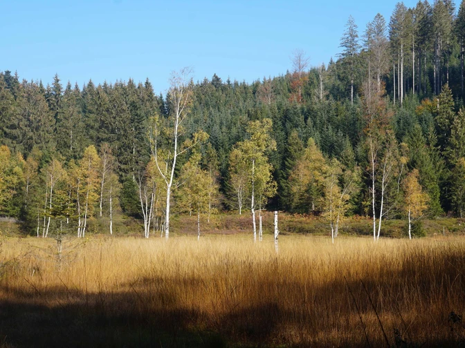 La randonnée longe également la tourbière bien conservée d’Enzenau. Cette tourbière offre des conditions idéales à des plantes rares comme la droséra, une plante carnivore, pour se développer.