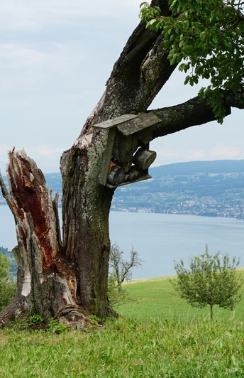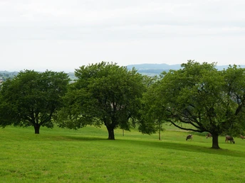 Les agriculteurs de Höfen s'engagent pour la biodiversité. Ils gèrent des prairies et pâturages extensivement, entretiennent les haies et plantent de nouveaux arbres fruitiers haute-tige. Grâce à une gestion adaptée, les agriculteurs créent les conditions pour des habitats précieux pour de nombreuses plantes et animaux indigènes. En achetant des produits alimentaires locaux - par exemple le cidre de pomme de Höfen - vous soutenez directement nos agriculteurs.