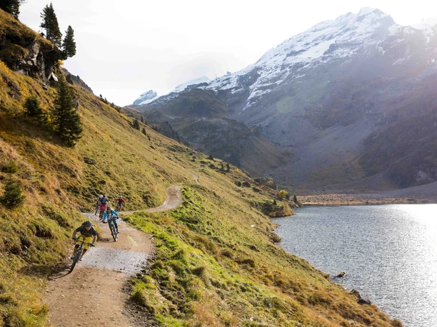 Depuis la gare d'Engelberg, point de départ du parcours des 4 lacs à vélo, vous allez jusqu’à la station de départ du téléphérique TITLIS puis continuez à gauche sur la route goudronnée Gerschnistrasse (attention à la circulation d’ouvriers) en direction d’Untertrübsee. Après être passé par l’alpage d’Untertrübsee, un chemin de gravier à gauche se détache après environ un kilomètre. À partir de là, il faut de bonnes jambes. Le gravier grossier met votre condition physique et votre technique de conduite à rude épreuve. La vue sur le Titlis et le fait de savoir qu’en haut vous continuerez avec le télésiège vous feront oublier les efforts. Les quelque 400 mètres de dénivelé entre Trübsee et le col Jochpass peuvent être franchis avec le télésiège. De là, un magnifique singletrail aménagé (1 mètre de large) vous conduit vers le lac Engstlensee. Besoin d’une petite pause ? L’eau glacée et cristalline du glacier vous rafraîchira. Une fois le lac dépassé, suivez un tronçon d’environ 600m le long de la Spycherflue jusqu'à Tannalp. Ensuite, vous descendez tranquillement sur une large route goudronnée le long du lac bleu foncé Tannalpsee et de beaux alpages, en direction du Melchsee. Arrivé à Melchsee-Frutt, vous prenez la Melchtalerstrasse vers Stöckalp.