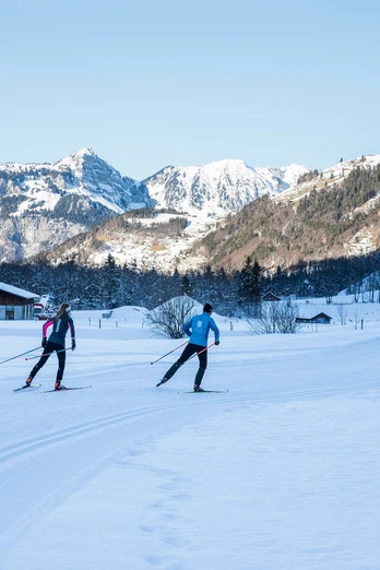 À la gare d'Engelberg, un bus local gratuit est disponible pour les amateurs de sports d'hiver et les emmène aux différents points de départ. Pour les fondeurs, l'arrêt à retenir est "Sportingpark". Accessible à pied en 5 minutes depuis la gare, il est considéré comme point de départ de la piste de fond et offre, en plus d'un vestiaire, des installations pour se doucher et se restaurer. Prêt pour la piste variée avec différents parcours dans la vallée d'Engelberg ? Que ce soit classique ou skating, sportif ou tranquille, les traces à travers la vallée offrent quelque chose pour tous. On glisse d'abord à plat, seulement légèrement en montée, le long de l'Engelberger Aa jusqu'au terrain de golf. Là, se trouve déjà la première possibilité de restauration, le restaurant Eienwäldli. La deuxième possibilité de restauration, le restaurant Wasserfall, est également située directement sur la piste et idéale pour une pause. Ensuite, il ne reste qu'un court trajet jusqu'à la station de base du Fürenalpbahn. De là, on peut faire une boucle supplémentaire via la piste plus exigeante Herrenrüti ou glisser en descente de retour à Engelberg. Un pass piste est nécessaire pour les pistes de ski de fond à Engelberg. Les clients hébergés utilisent les pistes gratuitement avec leur carte d'hôte.