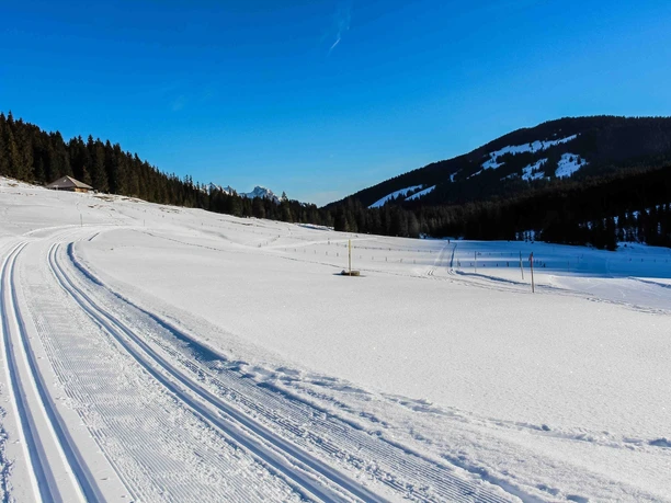 Le point de départ de la piste se trouve juste à côté du parking de Langis, d'où le parcours monte légèrement en traversant la vallée de Grossschlieren. Le trajet est en grande partie droit et vous conduit à travers une zone de tourbière protégée qui dégage une atmosphère mystique en hiver. Les espaces ouverts enneigés offrent des panoramas impressionnants tandis que la piste serpente à travers le paysage silencieux.