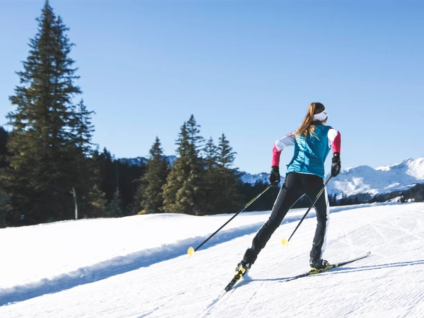 Après la zone de tourbière, le parcours entre dans une forêt calme. Ici, vous vivez le silence paisible de la forêt, interrompu uniquement par le léger glissement de vos skis sur la neige. Les arbres enneigés et l'air frais et pur rendent cette section particulièrement attrayante. La piste bien préparée offre des conditions optimales pour un ski de fond détendu et agréable.