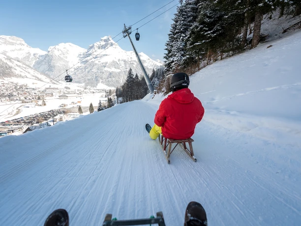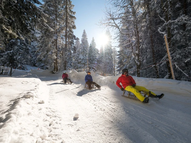 Le funiculaire emmène les lugers de la station de vallée Titlis rapidement au point de départ de la piste de luge, la Gerschnialp. Une fois en haut, on prend une luge rapide, qui peut être louée à la station en même temps que le billet de train, ou on utilise sa propre luge. Qui a la meilleure technique et arrive le plus vite en bas ? La piste de luge de 3,5 kilomètres descend en longues courbes à travers la forêt enneigée de Gerschnialp jusqu'au point de départ, la station de vallée Titlis. Cette descente en plein air de montagne ouvre l'appétit. Le restaurant Linie 8, juste à la station de vallée, propose une solution. Envie de cuisine indienne ? Le snack à côté de la sortie du téléphérique vous transporte dans un autre monde. Reboosté, on attaque la prochaine descente. La carte journée de luge offre du plaisir jusqu'au dernier trajet du funiculaire et inclut aussi un retour jusqu'à la station Trübsee.
