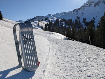 Le départ se fait depuis Wirzweli, à pied en direction d'Eggwald. À l'auberge Waldegg, il y a la location de luges et à côté, le transport par la télécabine Eggwald-Gummenalp avec des cabines 6 places jusqu'au point de vue de Gummenalp. La piste de luge fait environ 4,5 km et offre des sections allant du tranquille au rapide. La piste de luge ainsi que le sentier hivernal sont indiqués par des panneaux roses.