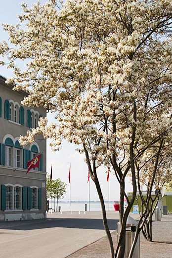 Depuis la gare de Lachen, tu empruntes la Mittlere Bahnhofstrasse, puis la Herrengasse, passes devant l'église paroissiale Heilig-Kreuz jusqu'à l'Ancienne place de l'école en direction de la place du lac et du port.