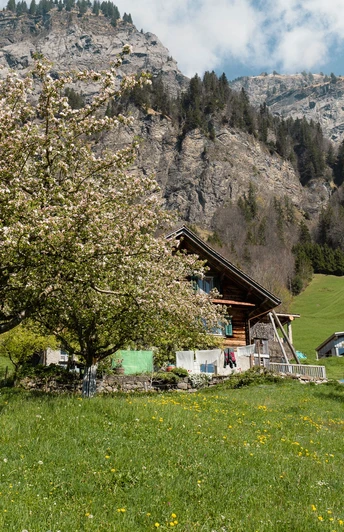 Vient ensuite la montée, où il vaut la peine de se retourner ou de s’asseoir sur un banc pour admirer le village d’en haut. Bientôt, nous apercevons au-dessus de nous la ferme Enzenen. Entre nous et la ferme se trouvent 74 arbres fruitiers haute-tige, dont les pommes et les poires sont transformées en jus sucré à l’automne.